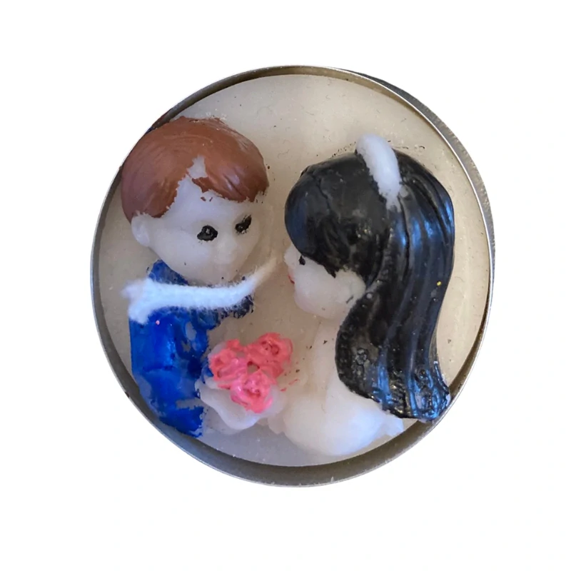 Čajová svíčka Novomanželé je jemná, romantická a symbolická dekorativní svíčka, ideální jako drobný dárek ke svatbě, k přání novomanželům nebo jako doplněk svatební výzdoby.