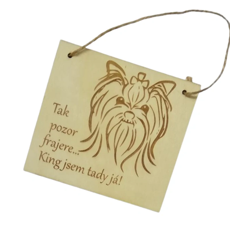 Cedulka s textem „Tak pozor frajere… King jsem tady já!“ dokonale vystihuje jeho povahu — malý král domácnosti, který přesně ví, jak si získat respekt i úsměv každého návštěvníka. Je to milá, hravá dekorace, která dodá domovu špetku humoru i jorkšíří noblesy.
