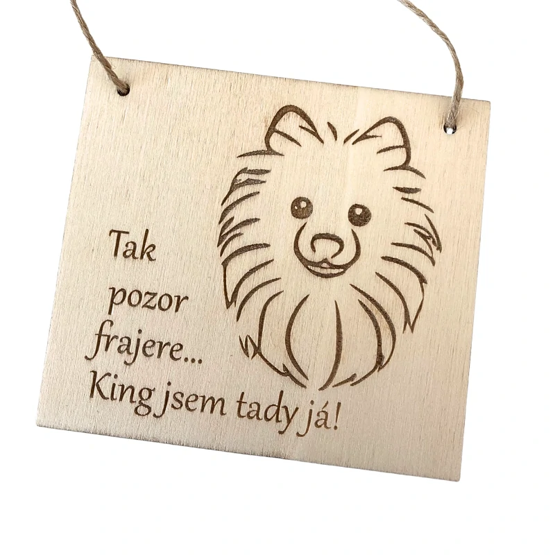 Cedulka s textem „Tak pozor frajere… King jsem tady já!“ dodává jeho povaze hravou nadsázku. Špic je sice andílek, ale zároveň malý sebevědomý král domácnosti, který přesně ví, že jeho přítomnost nikdo nepřehlédne. Tahle cedulka krásně spojuje jeho roztomilost, živost a oddanost.