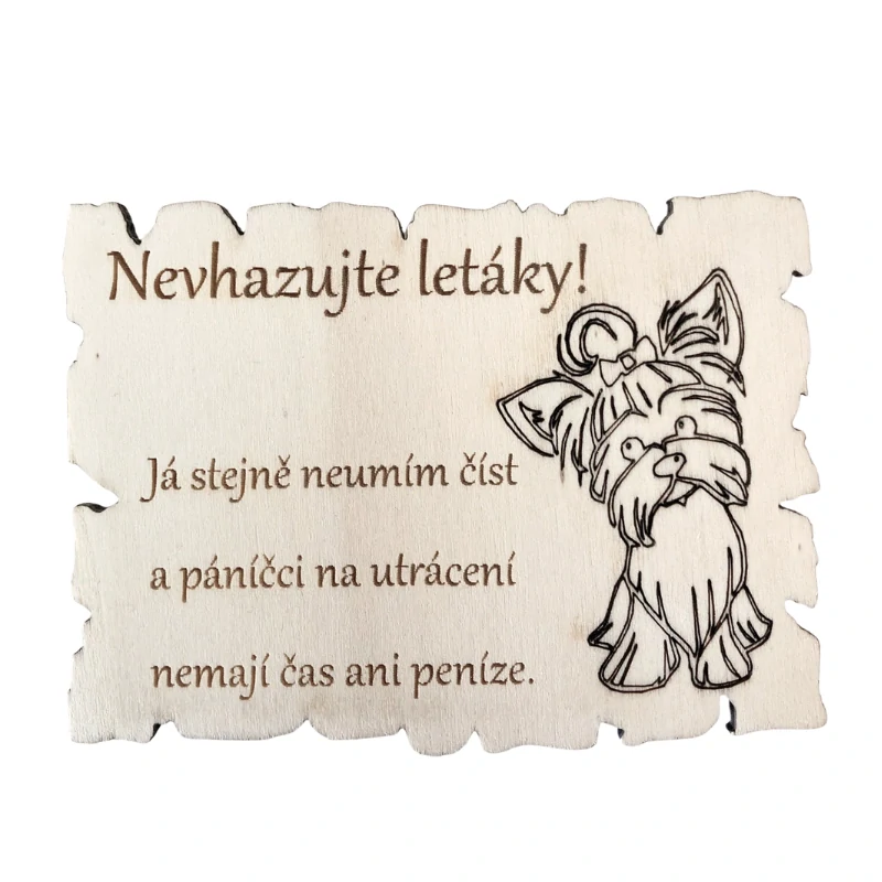 Jorkšírský teriér je malý pes s velkou osobností — živý, chytrý a neodolatelně roztomilý. Tahle cedulka zachycuje jeho typický výraz a doplňuje ho humorným textem, který pobaví každého doručovatele i kolemjdoucího.