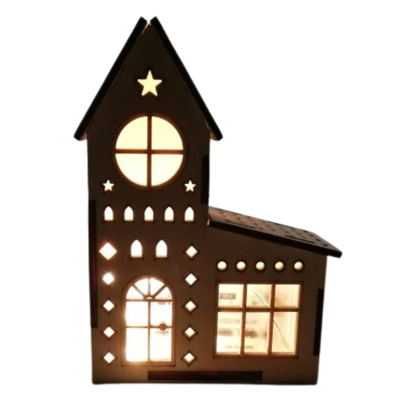 Tento poschoďový dřevěný domeček se světelným efektem je elegantní dekorací, která krásně doplní zimní i celoroční atmosféru domova. Je vyrobený z kvalitní topolové překližky a má výšku 15 cm, takže působí výrazněji než menší varianty, ale stále se pohodlně vejde na poličku, komodu, stůl nebo parapet.