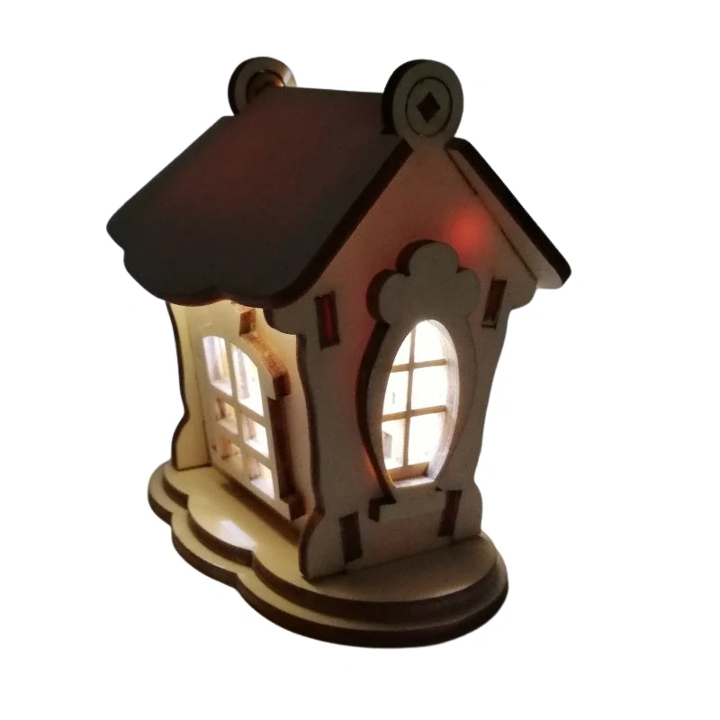 Jemné laserové detaily dodávají domečku elegantní vzhled a přírodní topolová překližka umožňuje ponechat dekoraci v čisté podobě nebo si ji dále dozdobit barvami, mořidlem či lakem.