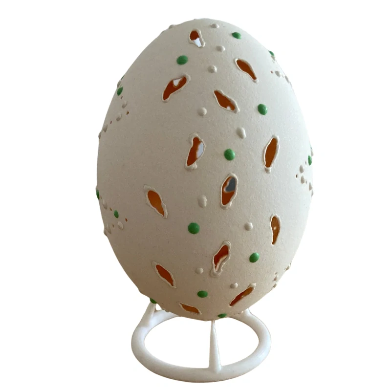 Každá kraslice je nejprve ručně vrtaná, aby vznikly jemné madeirové otvory. Následně je skořápka dezinfikovaná, což zajišťuje bezpečnost a čistotu při dalším zpracování i při dlouhodobém uchování. Poté následuje finální fáze zdobení — tradiční vosková technika, která dodává kraslici nádherný, plastický a originální vzhled. Každý kus je jedinečný a nese otisk ruční práce.