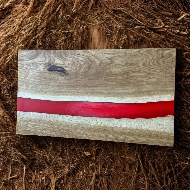 Tento originální podnos propojuje přírodní sílu dubu a sytost červeného epoxidu, jehož textura a kresba připomíná žhavý sopečnou lávu. Při pohledu na jedinečný vzor v epoxidu lze cítit tiché víření energie i tajuplné vlnění, ve kterém se barva a světlo vzájemně prolínají. Každý kus je ošetřen pro zvýraznění kresby dřeva i hloubky epoxidu.