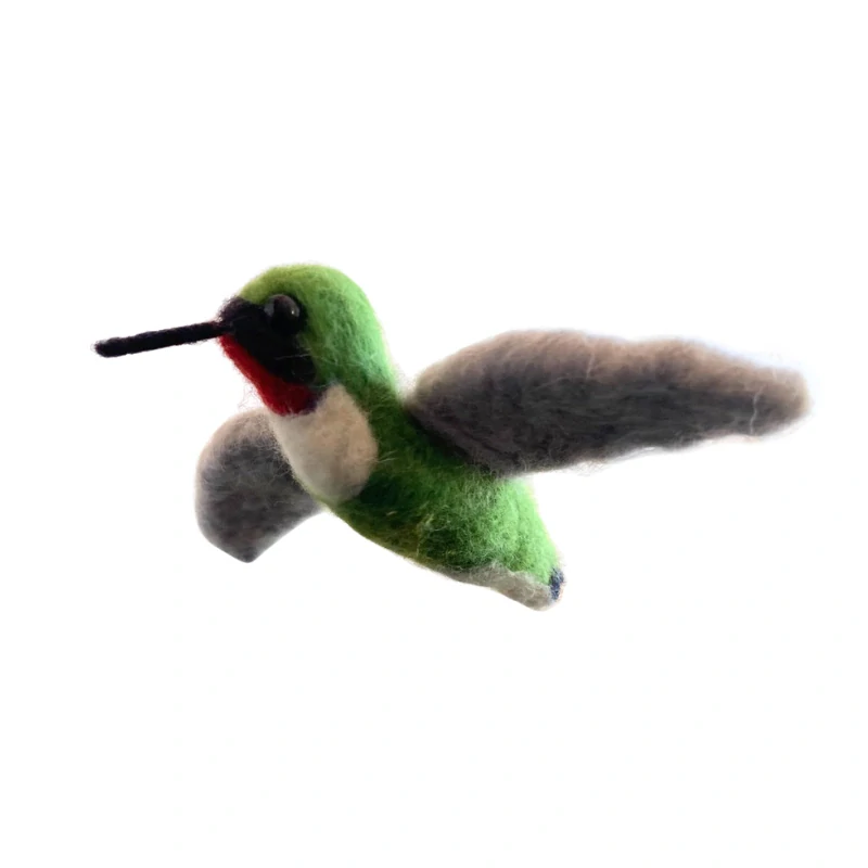 Tento jemný plstěný kolibřík je vytvořený tradiční technikou suchého plstění jehlou, při které se ovčí vlna postupně zpevňuje a tvaruje pomocí speciální jehly s mikroháčky. Každý kus vzniká ručně, bez forem a strojů, takže je naprostý originál.