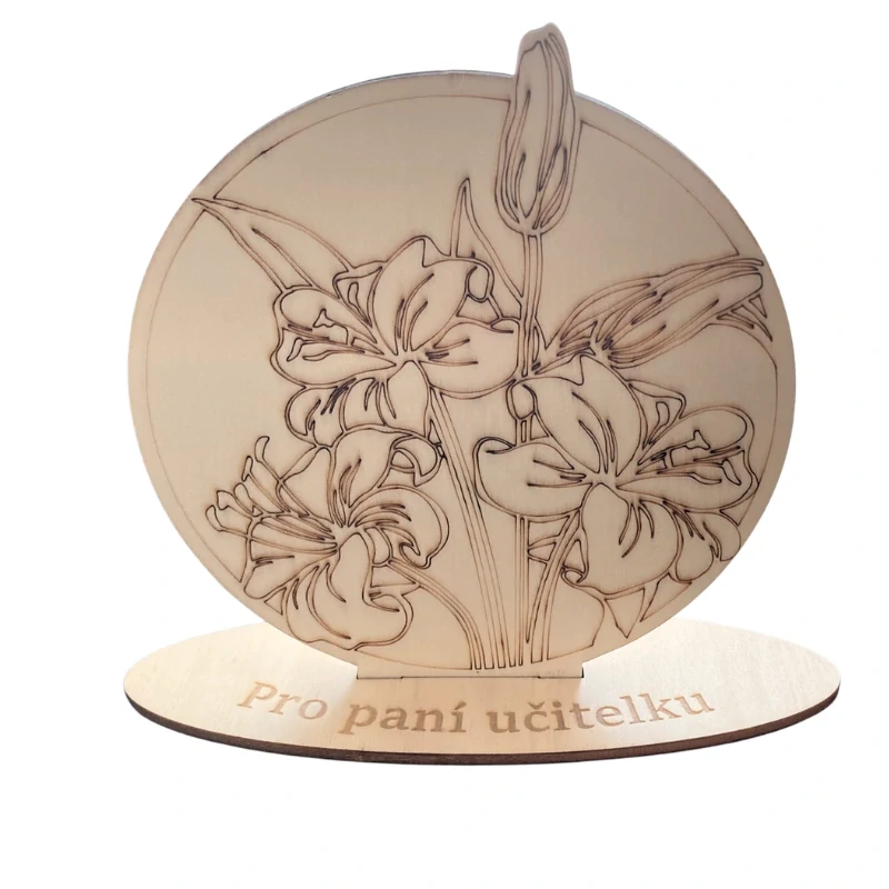 Dřevěná dekorace Malá lilie je jemný a elegantní doplněk, který krásně ozdobí polici, komodu, pracovní stůl nebo dětský pokoj. Motiv lilie je vyřezaný z kvalitní překližky a díky detailnímu zpracování působí čistě, něžně a dekorativně.