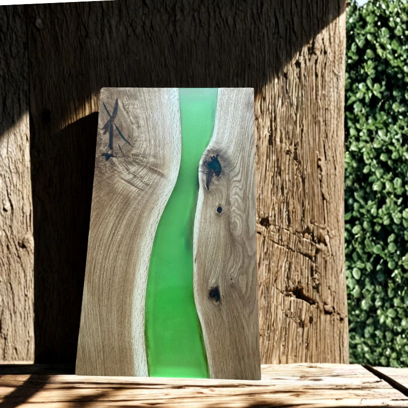 Tento podnos je jako úkaz tajemné záře lesa, kde neonově zelený epoxid připomíná jemné světlo světlušek vzbuzující pocit klidné magie a tajemství. Dubové dřevo s přirozenou kresbou tvoří dokonalý rámec pro tuto jemně svítící pryskyřici, která ve tmě září s lehkostí a noblesou. Hladký, pečlivě broušený povrch dodává výrobku jemnost a eleganci, zatímco kontrast mezi tmavým dřevem a pulsující zelení vytváří zážitek, který osloví všechny smysly a přenese vás do světa lesa zahaleného do tichých světelných záblesků.