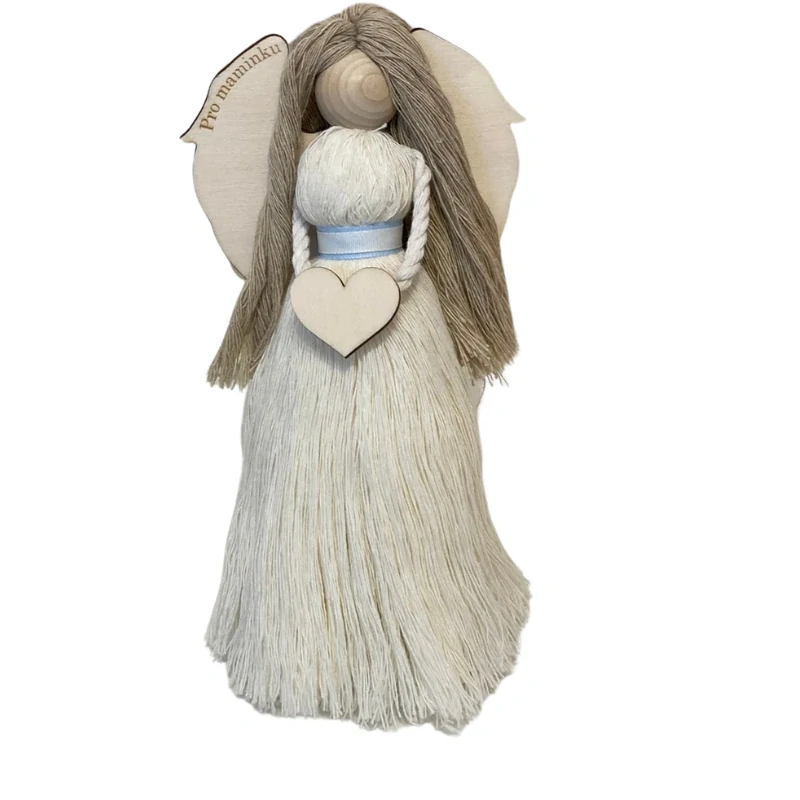 Macramé andělka Sněžinka je něžná dekorace určená k postavení. Její bílomodrý pásek a světlé tóny působí čistě a klidně.