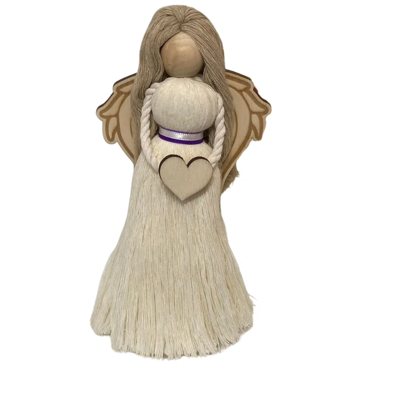 Dřevěná hlavička, měkké bavlněné šňůry a ručně tvořený střih vytvářejí dekoraci, která působí čistě, harmonicky a domácky. V rukou drží dřevěné srdce – symbol lásky, péče a ochrany. Fialový pásek jí dodává jemný, elegantní akcent.