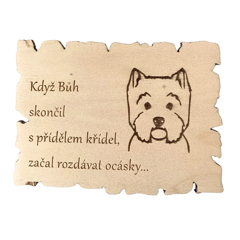 Westík je malý, ale sebevědomý pes s typickým rošťáckým výrazem a neuvěřitelně milou povahou. Je to plemeno plné energie, radosti a oddanosti, které si získá srdce každého svou bílou huňatou srstí a živým pohledem. Tato magnetka zachycuje jeho typický výraz a doplňuje ho citlivý text, který připomíná, jak výjimeční psi jsou.
