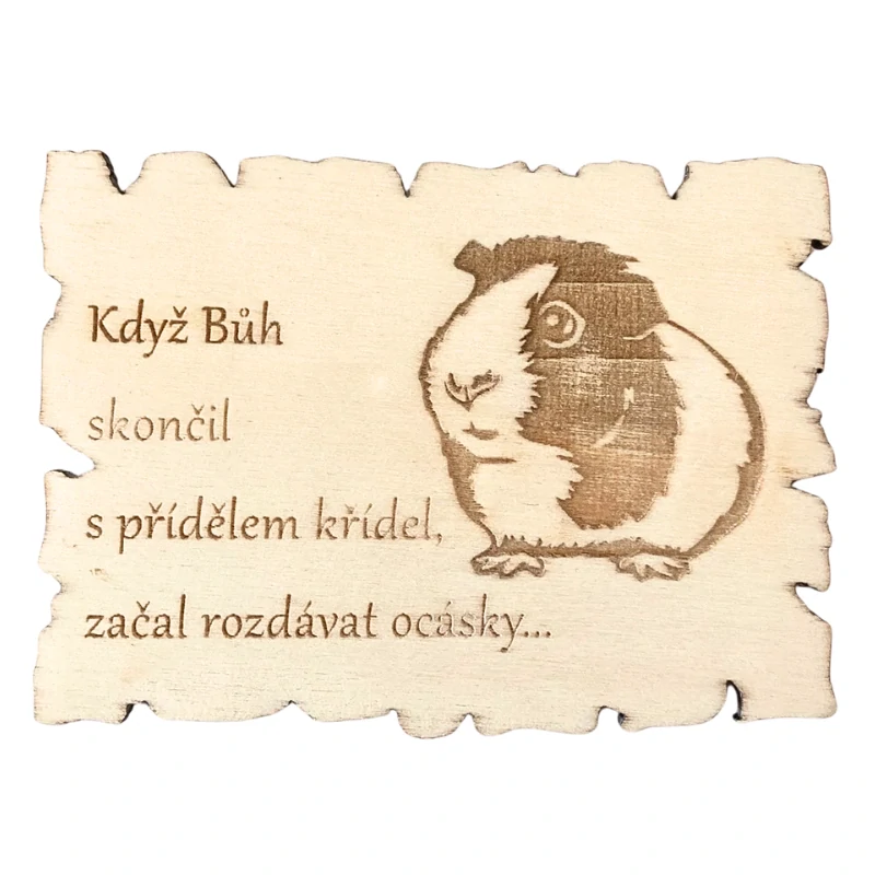 Morče je drobný mazlíček s jemnou povahou, zvědavým pohledem a typickým pískáním, které si získá srdce každého chovatele. A i když má ocásek jen malinký, pořád je to ocásek — a přesně to krásně ladí s textem na magnetce.