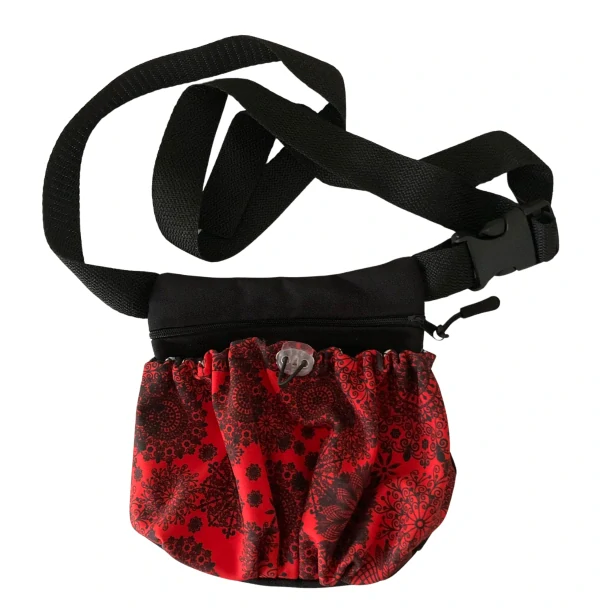 Tato praktická „bokovka“ vychází ze střihu kabelky Bokovka SVEA, jejímž autorem je Bára Mikulášková. Uvnitř najdete malou kapsičku ideální na klíče nebo drobnosti, které chcete mít vždy po ruce. Zvenčí je prostorná kapsa na gumu, kam snadno uložíte pamlsky – ty jsou tak bezpečně schované, ale zároveň okamžitě dostupné, kdykoli potřebujete svého pejska odměnit. Tato kapsa je ušita ze červeného softshelu a vnitřní strana je z bavlněného plátna. Doporučuji tedy spíše na suché dobroty.