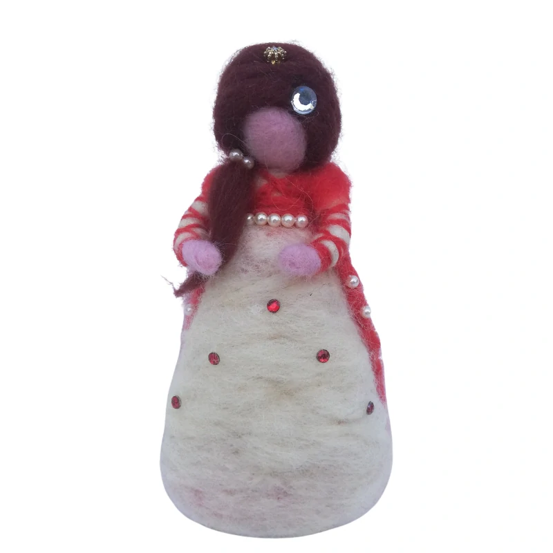 Tato elegantní plstěná princezna je vytvořená tradiční technikou suchého plstění jehlou, při které se ovčí vlna postupně zpevňuje a tvaruje pomocí speciální jehly. Každý kus vzniká ručně, bez forem a strojů, takže je naprostý originál.