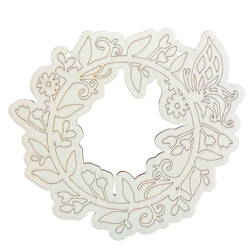 Tento jemně vyřezávaný květinový věnec o velikosti 29 cm je nádhernou dekorací, která spojuje přírodní motivy květů, lístků a elegantního motýla. Krásně vynikne na dveřích, stěně i v dětském pokoji. Dekoraci lze snadno dozdobit pastelkami, fixami, temperami nebo akrylovými barvami, takže si každý může vytvořit vlastní originální variantu.