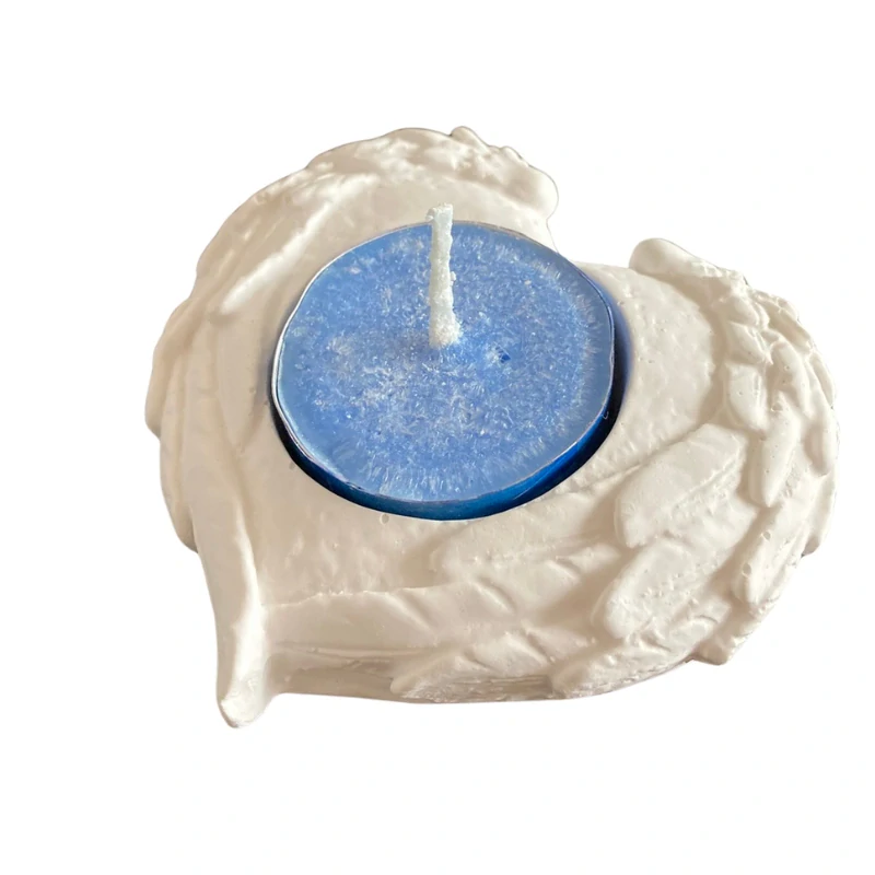 Srdce o velikosti 9 × 9 cm je doplněno čajovou svíčkou z palmového krystalického vosku. Po zapálení svíčka zvýrazní detaily křídel a dodá dekoraci hřejivou atmosféru.