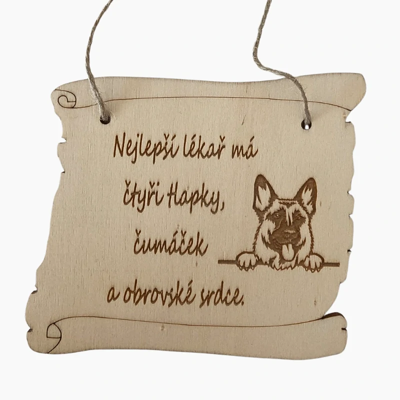 Cedulka s textem „Nejlepší lékař má čtyři tlapky, čumáček a obrovské srdce.“ dokonale vystihuje to, co majitelé německých ovčáků dobře znají: že jejich pes dokáže léčit už jen tím, že je nablízku. Tvar svitku dodává cedulce elegantní a originální vzhled, který se k tomuto majestátnímu plemeni skvěle hodí.
