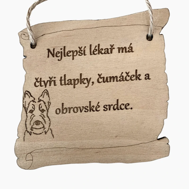 Cedulka s textem „Nejlepší lékař má čtyři tlapky, čumáček a obrovské srdce.“ dokonale vystihuje to, co majitelé setrů dobře znají — že jejich pes je ten nejlepší terapeut, mazlíček i přítel v jednom. Tvar svitku dodává cedulce elegantní a jemný vzhled, který se k setrovi nádherně hodí.