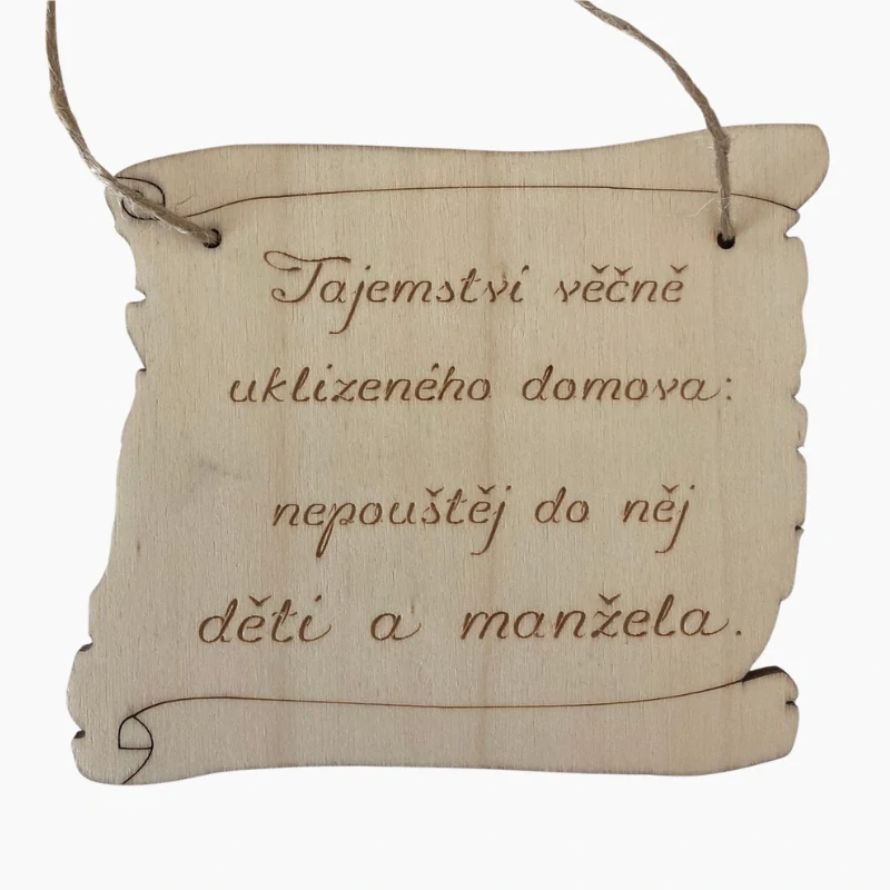 Každý domov má svá tajemství — a tahle cedulka jedno z nich prozrazuje s pořádnou dávkou humoru. Je ideální pro všechny, kteří berou domácí chaos s nadhledem a vědí, že dokonalý pořádek je často jen iluze… hlavně když se kolem pohybují děti a manžel.