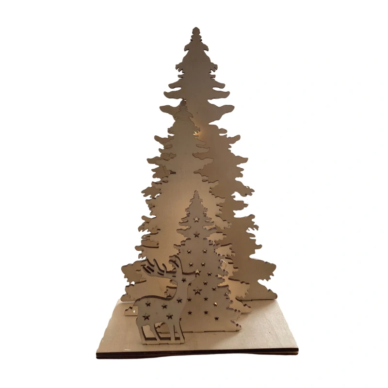 Tato svítící dřevěná dekorace s motivem lesa a jelena je nádherným zimním i celoročním doplňkem interiéru. Je vyrobená z kvalitní topolové překližky a má výšku 26 cm, takže se skvěle hodí na stůl, polici, komodu nebo parapet.