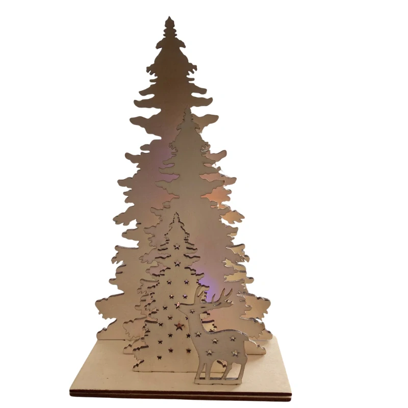 Tato svítící dřevěná dekorace s motivem lesa a jelena je nádherným zimním i celoročním doplňkem interiéru. Je vyrobená z kvalitní topolové překližky a má výšku 26 cm, takže se skvěle hodí na stůl, polici, komodu nebo parapet.