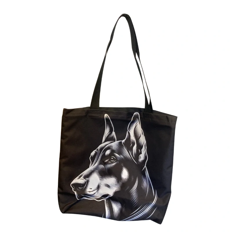 Taška je ušitá z kvalitní černé kočárkoviny, která je pevná, odolná a drží tvar. Velikost 42 × 42 cm poskytuje dostatek prostoru na nákup, věci do práce nebo výbavu na trénink. Dvě pevná ucha umožňují pohodlné nošení na rameni i v ruce. Motiv dobrmana je vytištěn tak, aby působil silně, elegantně a s typickou noblesou — přesně jako samotné plemeno.