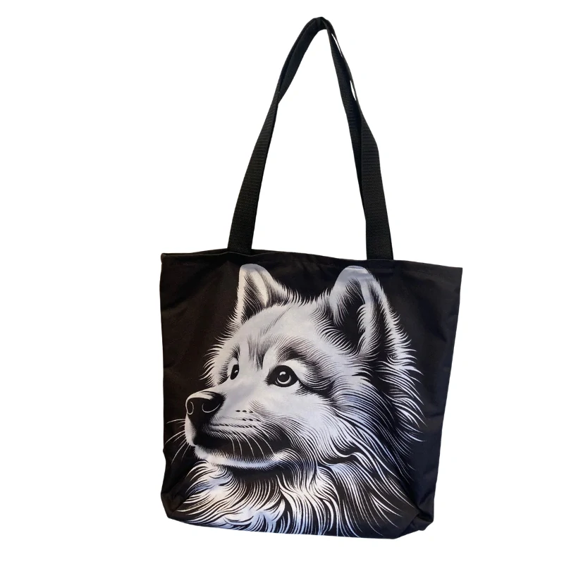 Taška je ušitá z kvalitní černé kočárkoviny, která je pevná, odolná a drží tvar. Velikost 42 × 42 cm poskytuje dostatek prostoru na nákup, věci do práce nebo výbavu na výlety. Dvě pevná ucha umožňují pohodlné nošení na rameni i v ruce. Motiv psa Kishu je vytištěn tak, aby působil čistě, elegantně a s typickou japonskou noblesou.