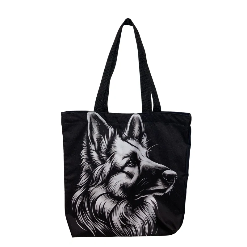 Taška je ušitá z kvalitní černé kočárkoviny, která je pevná, odolná a drží tvar. Velikost 42 × 42 cm poskytuje dostatek prostoru na nákup, věci do práce nebo výbavu na výlety. Dvě pevná ucha umožňují pohodlné nošení na rameni i v ruce. Motiv německého ovčáka je vytištěn tak, aby vynikla jeho typická silueta, výrazné rysy a důstojný pohled.