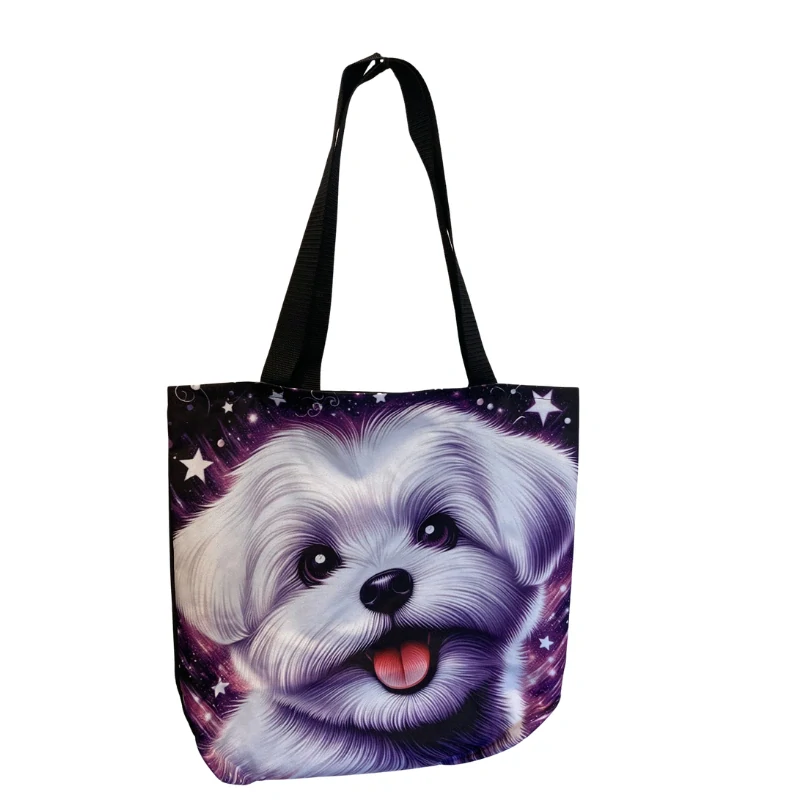 Velikost 42 × 42 cm poskytuje dostatek prostoru na nákup, věci do práce nebo výbavu na výlety. Dvě pevná ucha umožňují pohodlné nošení na rameni i v ruce. Motiv maltézáčka je vytištěn tak, aby působil jemně, čistě a s typickým něžným výrazem tohoto plemene.