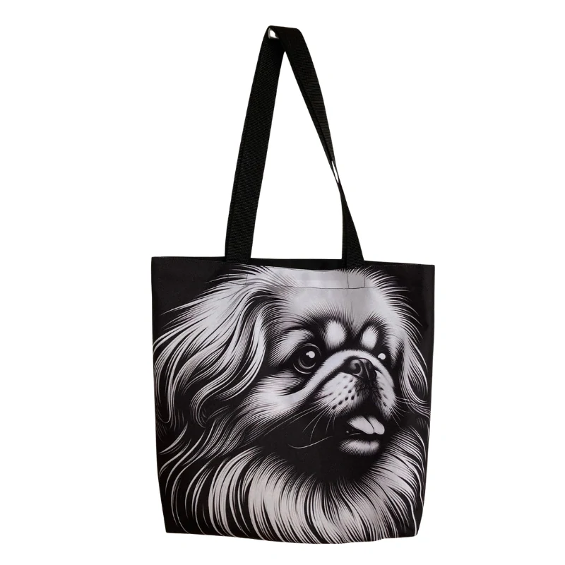 Taška je ušitá z kvalitní černé kočárkoviny, která je pevná, odolná a drží tvar. Velikost 42 × 42 cm poskytuje dostatek prostoru na nákup, věci do práce nebo výbavu na psí procházky. Dvě pevná ucha umožňují pohodlné nošení na rameni i v ruce. Motiv pekingského palácového psíka je vytištěn tak, aby působil živě, jemně a s typickým výrazem tohoto plemene — přesně tak, jak ho milují jeho lidé.