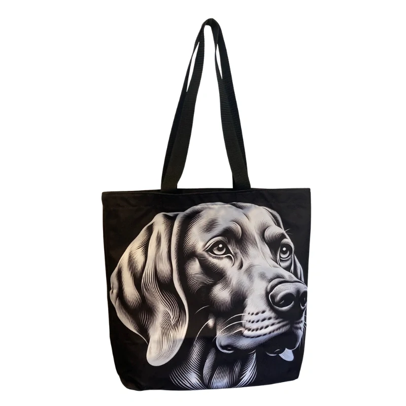 Taška je ušitá z kvalitní černé kočárkoviny, která je pevná, odolná a drží tvar. Velikost 42 × 42 cm poskytuje dostatek prostoru na nákup, věci do práce nebo výbavu na výlety. Dvě pevná ucha umožňují pohodlné nošení na rameni i v ruce. Motiv výmarského ohaře je vytištěn tak, aby vynikla jeho typická jemná hlava, výrazné oči a elegantní linie.