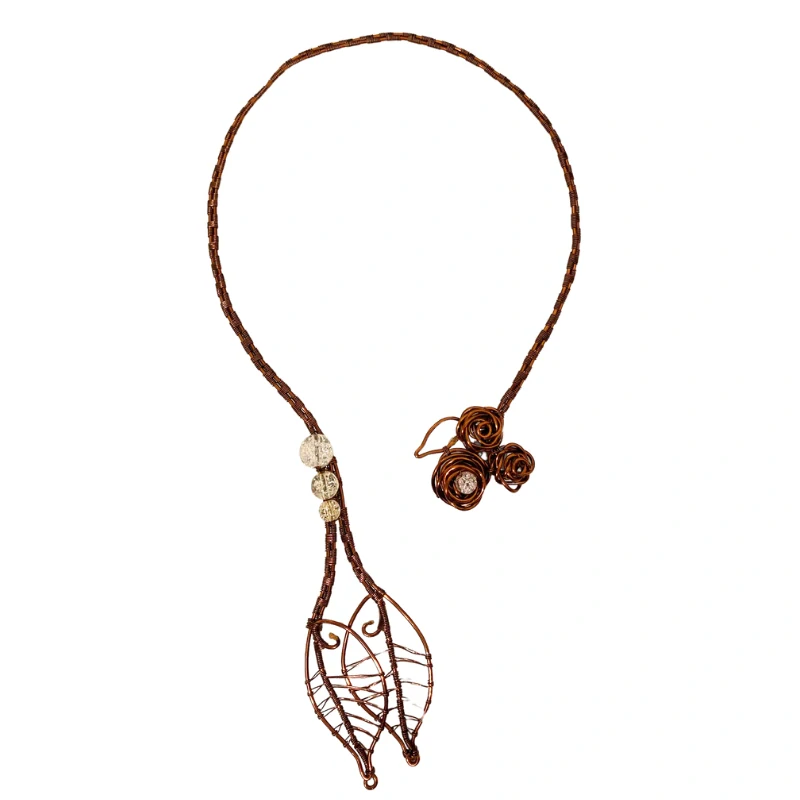 Tento torques je vytvořený pro ženy, které milují výrazné, ručně vyráběné šperky s duší. Každý ohyb a každý detail je tvarovaný technikou wire wrapping, která umožňuje vytvářet pevné, plastické a jedinečné šperky s organickým vzhledem. Použitý materiál — měď — dodává šperku teplý odstín, krásně patinuje a působí přirozeně a zemsky.
