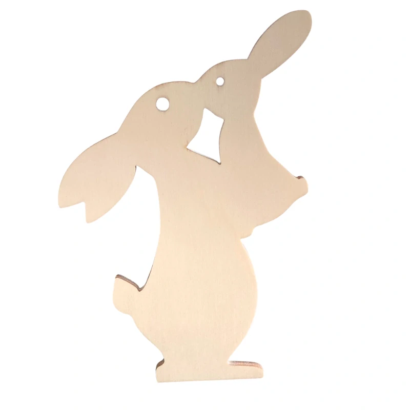 Dekorace je vyrobená z kvalitní překližky, laserovaná a následně ručně broušená, aby se odstranily opaly po laserování. Jemné linie a tvar dvou zajíčků vytvářejí milý a harmonický motiv.