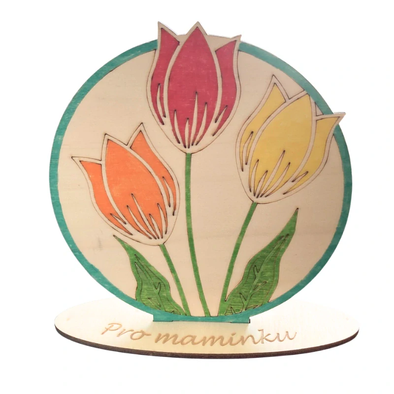 Dřevěná dekorace Tulipány je něžný, veselý a univerzální doplněk, který krásně ozdobí polici, komodu, pracovní stůl nebo dětský pokoj. Motiv tří tulipánů je vyřezaný z kvalitní překližky a díky detailnímu zpracování působí čistě, elegantně a přírodně.