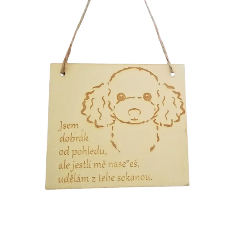 Boloňský psík je něžný, tichý a velmi citlivý společník. Má jemnou povahu a přirozenou touhu být nablízku svým lidem. Je to pes, který dokáže domov zjemnit svou klidnou přítomností a vnést do něj pocit bezpečí a pohody. Je to plemeno, které miluje jistotu, jemné vedení a blízkost. Rád sdílí každodenní rituály, tiše doprovází svou rodinu a vnímá její nálady s překvapivou citlivostí. Jeho drobná velikost a laskavý výraz z něj dělají malého andílka, který si získá srdce každého. Právě proto působí tahle cedulka s nadsázkou tak roztomile — kontrast mezi jeho něžnou povahou a odvážným textem vyvolá úsměv u každého, kdo projde kolem.