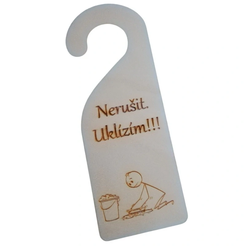 Visačka „Nerušit. Uklízím!!!“ je ideální pro všechny, kteří chtějí mít při úklidu klid — nebo aspoň chtějí, aby to tak vypadalo. Gravírovaný motiv postavičky na kolenou s kýblem okamžitě vysvětlí, co se za dveřmi děje. Text je výrazný, čitelný a pobaví každého, kdo kolem projde.