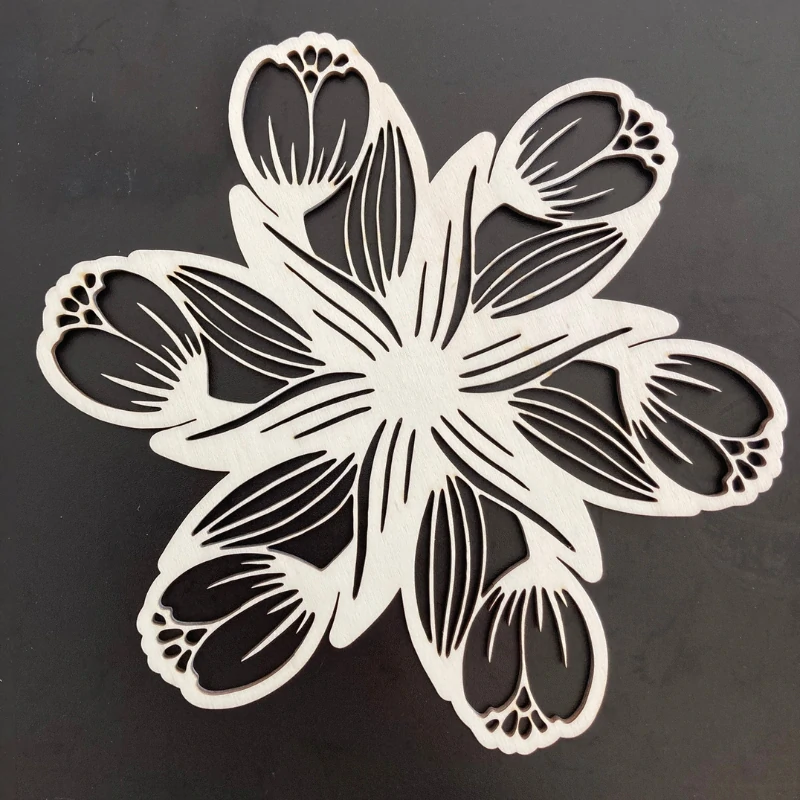 Tento elegantní květinový ornament o velikosti 25 cm je tvořen šesti tulipány. Jemné laserové linie dodávají dekoraci lehkost a krásnou strukturu, která vynikne na dveřích, stěně nebo jako součást jarní výzdoby. Přírodní povrch je ideální pro kreativní tvoření — dekoraci lze snadno vybarvit pastelkami, fixami, temperami nebo akrylovými barvami.