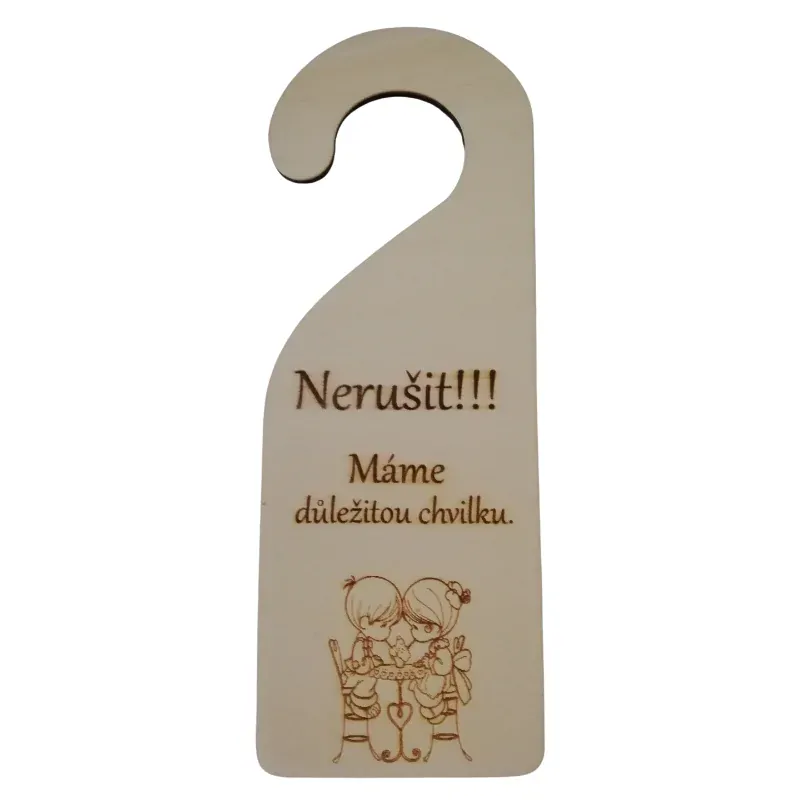 Vyrobená z kvalitní překližky, lehká, odolná a s precizním laserovým gravírováním. Rozměr 19 × 7 cm zajišťuje dobrou viditelnost a snadné zavěšení na jakoukoli kliku.