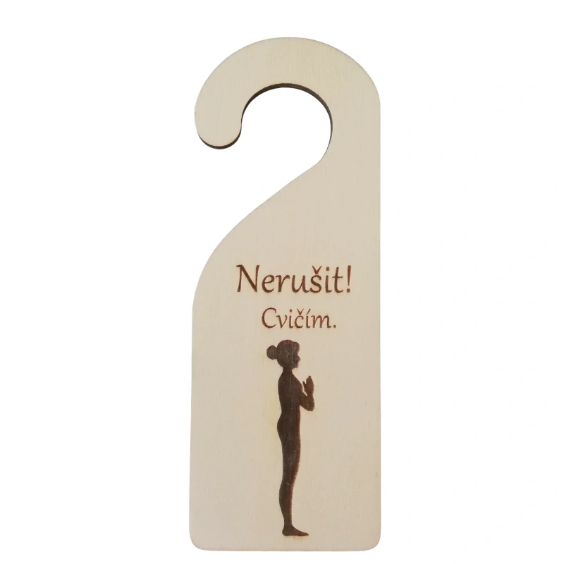 Visačka „Nerušit! Cvičím.“ je ideální pro všechny, kteří si chtějí dopřát chvíli klidu, soustředění a vnitřní rovnováhy. Gravírovaný motiv postavičky stojící v pozici Namaste (ruce spojené u hrudníku) dodává cedulce harmonii, jemnost a příjemnou atmosféru, která dokonale vystihuje moment ticha, respektu a mindfulness.