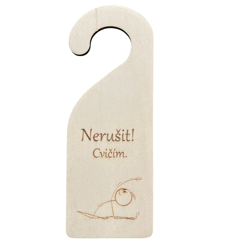 Visačka „Nerušit! Cvičím.“ je ideální pro všechny, kteří si chtějí dopřát klid na cvičení, protažení nebo krátkou pohybovou pauzu. Gravírovaný motiv postavičky v jednoduché strečinkové pozici dodává cedulce energii, lehkost a příjemně sportovní atmosféru.