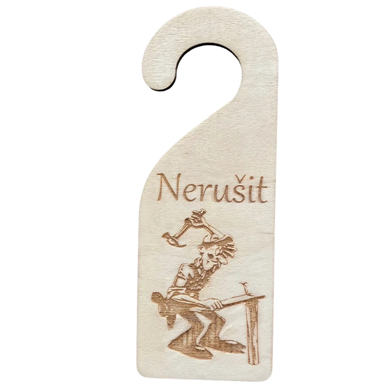 Visačka „Nerušit“ je ideální pro všechny, kteří potřebují klid na kutění, opravy nebo tvoření. Gravírovaný motiv postavičky, která zatlouká hřebík do prkna, dodává cedulce humor, energii a příjemně řemeslnou atmosféru. Skvěle vystihuje moment soustředění, kdy je potřeba dokončit práci bez vyrušování.
