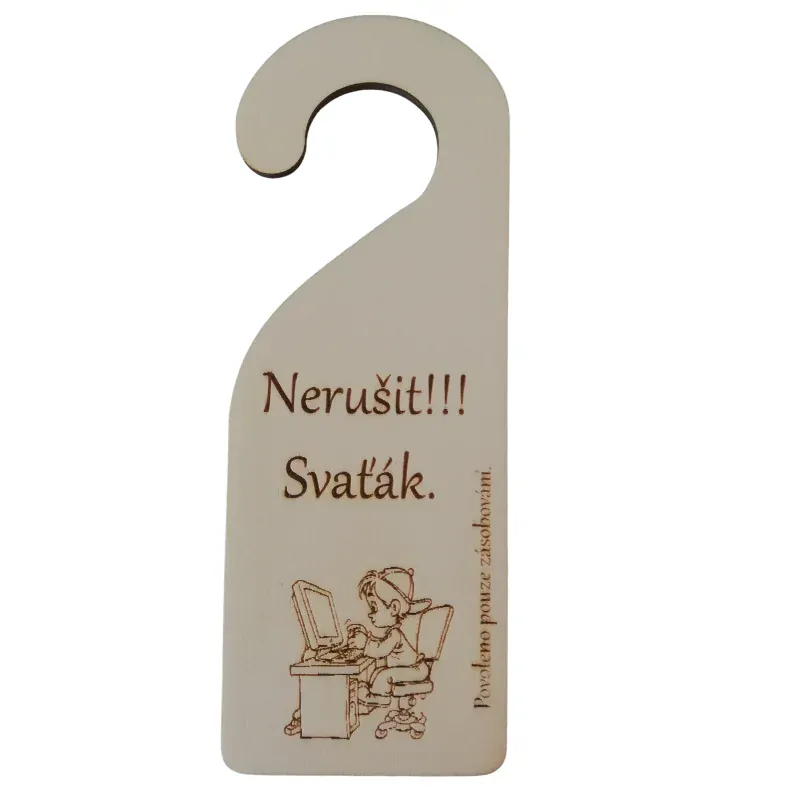 Vyrobená z kvalitní překližky, lehká, odolná a s precizním laserovým gravírováním. Rozměr 19 × 7 cm zajišťuje dobrou viditelnost a snadné zavěšení na jakoukoli kliku.